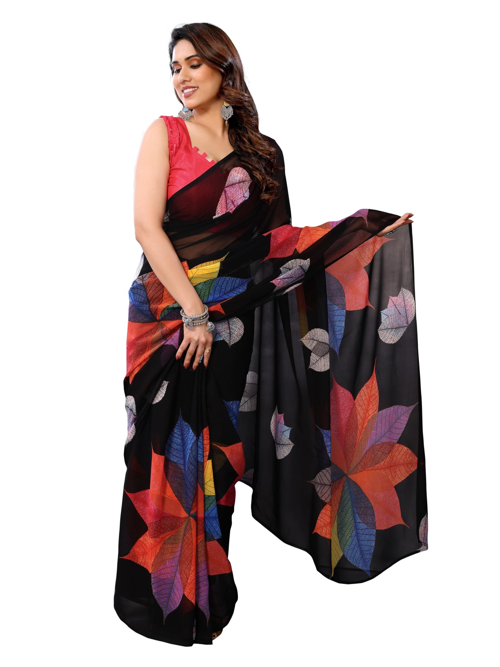 StyleScope Women's Printed Georgette Ready To Wear One Minute Saree With Unstitched Blouse Piece (RTW Paan)